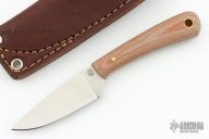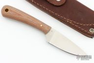This knife by LT Wright features a satin finished flat ground blade with .134" blade stock and .974" blade depth, full tang construction. The handle has canvas micarta scales with brass pins. Comes with original box and brown leather sheath (left handed sheath). Excellent condition.