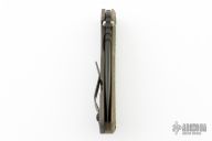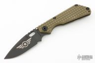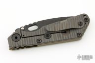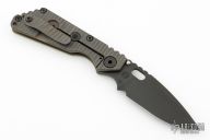 This SNG by Strider Knives features a black blade with notched thumbrest and thumbhole. The handle has a Frag pattern green G-10 and flamed titanium frame with matching tip up clip. Nice detent, lockup and blade seating. Excellent Condition.