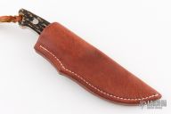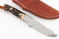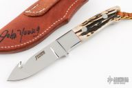 This Gut Hook Skinner by John Young features a mirror polished blade with gut hook, .206" blade stock and 1" blade depth, full tapered tang construction. The handle has a mirror polished stainless guard, stag scales and red liners. Lanyard hole at butt. Comes with brown leather sheath. Excellent condition.