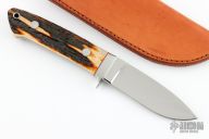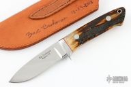 This Dropped Hunter by Zac Buchanan features a mirror polished drop point blade with .165" blade stock and 1.040" blade depth, full tapered tang construction. The handle has a satin finished stainless steel guard, stag scales with thin red spacers/liners, lanyard hole. Comes with a brown leather sheath. Excellent condition.