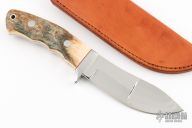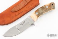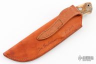 This Loveless Style Nessmuk-Pro by Zac Buchanan features a mirror polished Duplex Ground blade with .168" blade stock and 1.277" blade depth, full tapered tang construction. The handle has a satin finished stainless steel guard, mammoth ivory scales with thin red spacers/liners, lanyard hole. Comes with a brown leather sheath signed and dated 12-25-2013. Excellent condition. Comes with a COA from Zac Buchanan saying this is his first duplex ground knife.