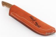This XL Hunter by John Young features a mirror polished blade with notched thumbrest, .206" blade stock and .926" blade depth, full tapered tang construction. The handle has a mirror polished stainless bolsters, mammoth ivory scales and red liners. Lanyard hole at butt. Comes with brown leather sheath. Excellent condition.