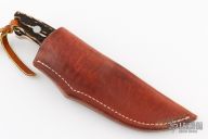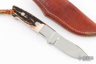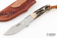 This Knife by John Young features a mirror polished blade with .203" blade stock and 1.030" blade depth, full tapered tang construction. The handle has a mirror polished stainless bolsters, stag scales and red liners. Lanyard hole at butt. Comes with brown leather sheath. Excellent condition.
