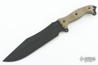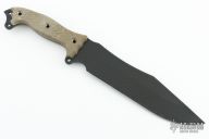 This Battle Cry by Busse Combat features a black coated blade with .217" blade stock and 2.211" blade depth, full tang construction. The handle has green canvas micarta scales. New from maker.