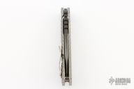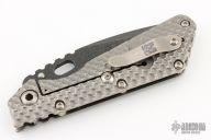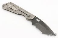 This Mick Strider custom XL framelock folder has a Rhino Yeti acid etched blade with notched thumbrest and thumbhole. The handle has a double gunner grip titanium frame with laser engraved titanium clip. Includes Hinderer "Lock Bar Stabilizer" for maximum reverse lock retention. Nice lockup, blade seating and detent. Includes a padded zippered case.  Excellent Condition.