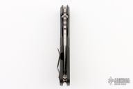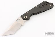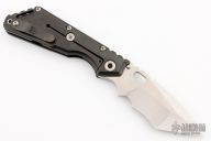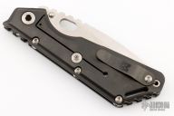 This Mick Strider custom SMF XL framelock folder features a satin nightmare ground drop point blade with stonewashed flats, notched thumbrest and thumbhole.  Dragon textured blade spine. The handle has a black titanium frame with a titanium clip, tip up carry. Jimping on blade spine. Includes Hinderer "Lock Bar Stabilizer" for maximum reverse lock retention. Nice lockup, detent, and blade seating. Excellent work. Signed on underside of tang. Comes with zippered case. Excellent Condition.
