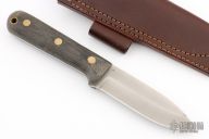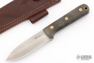 This Genesis by LT Wright features a satin finished saber ground blade with .120" blade stock and 1.197" blade depth, full tang construction. The handle has black canvas micarta scales. Comes with original box and brown leather sheath. Excellent condition.