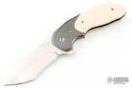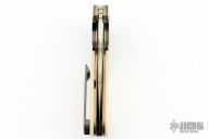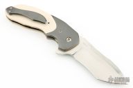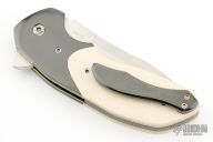 This Uprising by Joel Chamblin features a hand rub satin finished tanto recurve blade with notched thumbrest and a flipper. The handle has Zirconium bolsters and tip up clip, ivory paper micarta scales, anodized titanium liners and backspacer. Nice detent, lockup and blade seating. Jared Von Otterloo Design. Has a couple light scratches, otherwise excellent condition.