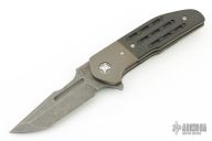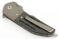This Strife by Dustin Turpin features an acid tumble finished tanto S35VN blade with fullers, notched thumbrest and flipper. The handle has a bead blasted titanium frame and bolsters, carbon fiber scales and matching tip up clip. Has a three-piece backspacer of black G-10 and titanium. Nice detent, lockup and blade seating, rides on bearings. Excellent condition.
