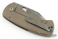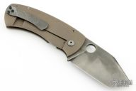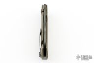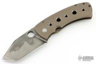This FMUK by Jonathan McNees features a flat ground tanto blade with hamon and dual thumbstuds. The handle has a tumble and bead blast finished titanium scales with hammered pivot, textured zirconium backspacer and matching tip up clip. Nice detent, blade seating and lockup. Has some light scuffs and scratches, otherwise great condition.