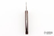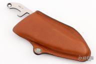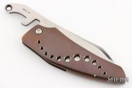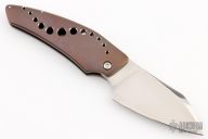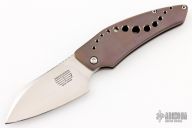 This knife by Tashi Bharucha features a hand rub satin finished blade with friction folder style opening, has an etched circle pattern on blade spine. The handle has a bead blasted and anodized titanium frame with hole pattern. Comes with brown leather sheath. Has a couple light scuffs and scratches, otherwise excellent condition.