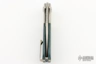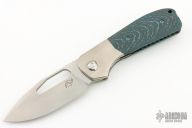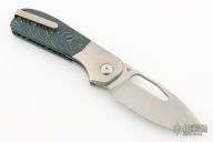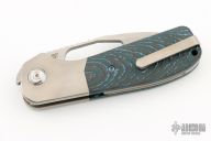 This Field Duty by Reate is a Liong Mah design, it features a hand rub satin finished blade with notched thumbrest and a thumb hole. The handle has a blasted titanium frame with Blue/black carbon fiber scales, titanium backspacer and tip up clip, lanyard pin. Comes with original Velcro case and packaging. New Condition.  #041/125