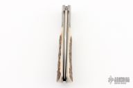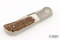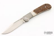 This Slipjoint by J.E. Made Knives features a satin finished clip point blade with swedge and hollow long pull. The handle is comprised of fluted titanium bolsters with integral liners and stag covers and a stainless steel spring. Lanyard hole in pommel. Has half-stop, flush in all positions. Comes with zippered case, tools and extra hardware. Excellent condition. Dated 2018