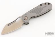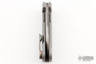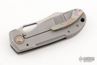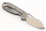 This Mini Possum by Jason Stout and Jeremy Horton features a chisel ground tumbled blade. The handle has a tumble finished titanium frame with D2 backspacer, and Timascus clip. Mill pattern on the show side. Nice detent, lockup and blade seating. Has a couple light scuffs, otherwise excellent condition.