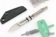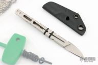 This 2049 Mini Hurricane Razor from Amsler Knives features a stonewashed handle/blade with orange splatter. This unique piece has a removable, discreet, pocket clip. Screws and clip are anodized titanium. Sharpened portion fits securely into a kydex sheath. Knife can be carried in a shirt pocket because of its small/discreet nature. Includes COA and original chains and tool.  Excellent condition.