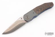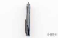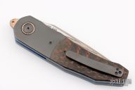 This linerlock flipper from Andre Thorburn and Andre Van Heerden features a Stainless Yu-Shoku blade with VG-10W core, a false top edge, notched thumbrest and front flipper. The handle has copper snakeskin carbon fiber scales, zirconium bolsters with super conductor pivot collars, carbon fiber backspacer, anodized titanium liners, and a zirconium clip, tip up carry. Features DUAL ROW IKBS. Excellent fit and finish. Smooth action. Includes a nylon velcro case and COA. Excellent condition.