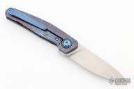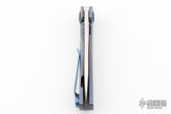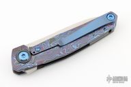 The Isola from Jens Anso features a hand rub satin finished blade with notched flipper. The handle has a milled black timascus frame with zirconium pivot collars, anodized titanium screws, zirconium backspacer with lanyard hole and clip positioned for tip up carry. Comes with original box and COA dated March 15, 2022. Rides on bearings, nice detent, lockup and blade seating. Excellent condition.