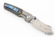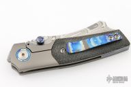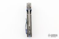This Production Mini Barber by Berg Blades features a Damasteel blade with notched thumbrest and dual black timascus thumbstuds. The handle has a stonewashed titanium frame with black micarta scales, black timascus backspacer and tip up clip. Nice detent, lockup and blade seating. Excellent condition. Comes with original box, zippered case and papers.