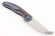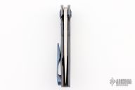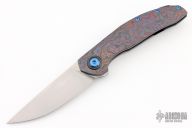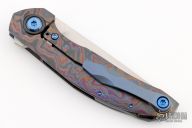 This Orso flipper by Jens Anso features a hand rub satin finished blade with notched flipper. The handle has a fine, checker milled and black timascus frame, zirconium pivot collars and backspacer with lanyard hole, anodized titanium pocket clip that is positioned for tip up carry. This piece has a stainless steel lockbar insert and over travel stop. Rides on bearings. Nice detent, lockup and blade seating. This is a stunning example of Mr. Anso's talent. Comes with original box and COA dated April 2023. Excellent condition.