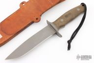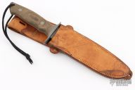 This Fighter by RJ Martin features a duplex ground bead blasted blade with .272" blade stock and 1.299" blade depth, full tapered tang construction. The handle has a bead blasted stainless steel guard and green canvas micarta scales. Comes with a brown leather sheath, not original but fits. Has some scuffs and scratches, otherwise good condition. Dated 1994