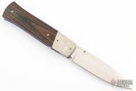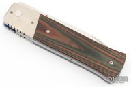 This D/A Auto by Mike Sitton features a hand rub satin finished blade with a single thumbstud. The handle has satin titanium bolsters, black/red linen micarta scales, anodized titanium liners and a stainless steel backspacer with lanyard pin. Nice detent, lockup and blade seating, nice action. Has a couple light scratches, otherwise excellent condition.