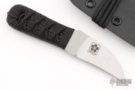 This Hawkbill Neck Knife by Josh Mason features a satin blade with .154" blade stock, .925" blade depth with hidden tang construction. The handle has a wrapped handle over black shark skin. Comes with a Kydex sheath and paracord. New from maker.