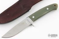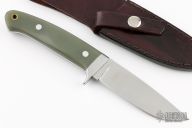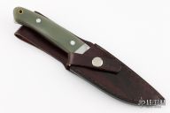 This knife by Benjahmin Knives features a mirror polished blade with .186" blade stock and 1.119" blade depth, full tapered tang construction. The handle has a stainless steel guard with jade G-10 scales, lanyard hole at the butt. Comes with a black leather sheath. New from maker.