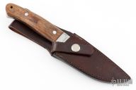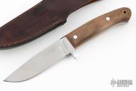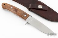 This knife by Benjahmin Knives features a mirror polished blade with .176" blade stock and 1.124" blade depth, full tapered tang construction. The handle has a stainless steel guard with walnut scales with natural linen micarta liners, lanyard hole at the butt. Comes with a black leather sheath. New from maker.