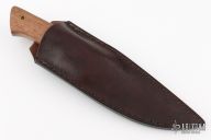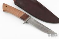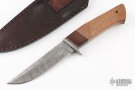 This knife by Benjahmin Knives features a Damascus blade with false top edge, .208" blade stock and 1.108" blade depth, hidden tang construction. The handle has a Damascus guard with a wood grip with micarta and nickel silver spacers. Comes with a black leather sheath. New from maker.