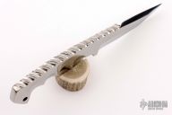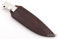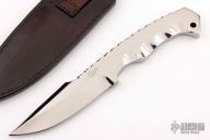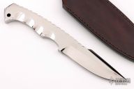 This knife by Benjahmin Knives features a mirror polished blade and handle with false top edge and fileworked spine notched thumbrest, .371" blade stock and 1.391" blade depth full integral construction. Comes with a black leather sheath. New from maker.