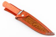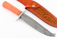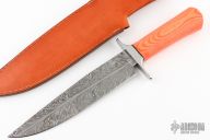 This knife by Benjahmin Knives features a Feather Damascus blade with .237" blade stock and 1.763" blade depth, hidden tang construction. The handle has a stainless steel guard with an orange linen micarta grip with micarta with a black spacer. Comes with a brown leather sheath. New from maker.