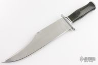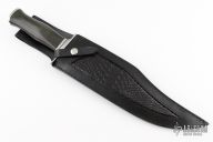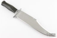 This knife by Benjahmin Knives features a mirror polished blade with false top edge, .219" blade stock and 2.295" blade depth, hidden tang construction. The handle has a stainless steel guard and butt with a black linen micarta grip. Comes with a black leather sheath. New from maker.