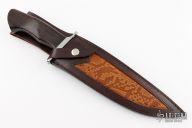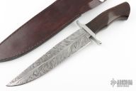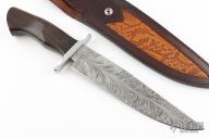 This knife by Benjahmin Knives features a Feather Damascus blade with .209" blade stock and 1.763" blade depth, hidden tang construction. The handle has a stainless steel guard with a dark wood grip with a black spacer. Comes with a leather sheath. New from maker.