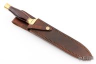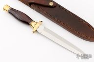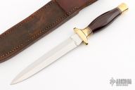 This knife by R Gilman features a mirror polished double edged blade with .150" blade stock and .980" blade depth, full tang construction. The handle has a brass guard and butt with maroon linen micarta grip, black/white/red spacers. Comes with a brown leather sheath. Excellent condition.