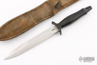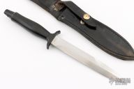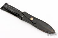 From the excellent resource of militarycarryknives.com: "The Command II knife is very similar to the Mark II. It has the same handle and the blade is the same length. However the Command II blade differs in several ways. First, the blade is not double-edged. Only the bottom edge and 3 inches at the front of the top edge are sharpened. Second, there are serrations (teeth) only on 2 of the 3 inches of the sharpened top edge. I've only noted one Command II blade without serrations. I don't know much about these knives. They were possibly designed for locations where a double-edged knife was illegal. They are serialized in the same manner as the Mark II. They can be found with tool steel blades and 6-digit numeric serial numbers (e.g. 007203) as well as stainless steel blades with an alpha-numeric serial number (e.g. A7420S). They were issued in two versions, the first with a satin finish blade and the second with a black blade. There were no camouflage versions of this knife. For the satin finish blade knives, the highest tool steel bladed serial number I've noted is 015197. The highest stainless steel bladed serial number I've noted is A9444S. The black blade models were only offered in stainless steel. The black bladed serial number range I've noted is between A3512S and A8019S. These serial number ranges imply that less than 22,700 of the Command II knives were produced. The Command II was probably produced only between late 1979 and 1982. I suspect that there wasn't a big demand for these knives and so they were discontinued. " This one has some scuffs and scratches, otherwise good condition with the original sheath. Serial 010347.