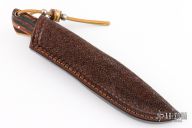 This hunter by Richard Self features a satin finished drop point blade with notched thumbrest, .135" blade stock and .977" depth, full tang construction. The handle has dovetailed stainless steel bolsters and stag scales. Lanyard hole and nice filework on spine of tang. Comes with a hand tooled brown leather sheath. Excellent condition. This knife model was awarded Blade Magazine's Best Hunter award of 2006.