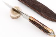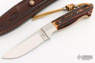 This hunter by Richard Self features a satin finished drop point blade with notched thumbrest, .135" blade stock and 1.030" depth, full tang construction. The handle has dovetailed stainless steel bolsters and stag scales. Lanyard hole and nice filework on spine of tang. Comes with a hand tooled brown leather sheath. Excellent condition. This knife model was awarded Blade Magazine's Best Hunter award of 2006.