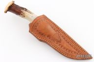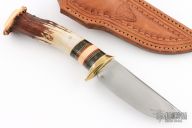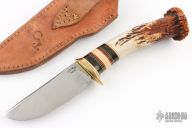 This knife by CJ Moll features a hand rub satin finished blade with false top edge, .238" blade stock and 1.182" blade depth, hidden tang construction. The handle has brass guard, crown stag butt and spacer pattern of white/brass/black micarta/black/red/ivory paper micarta. Comes with a hand tooled brown leather sheath. Has some patina and light scratches, otherwise good condition.