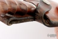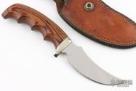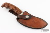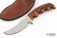This Skinner by Track Knives features a mirror polished blade with notched thumbrest, .156" blade stock and 1.329" blade depth, hidden tang construction. The handle has a nickel silver guard and laminated wood grip. Comes with leather sheath. Has some scratches, otherwise good condition.