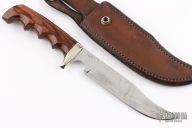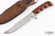 This hunter by Track Knives features a mirror polished blade with .156" blade stock and 1.100" blade depth, hidden tang construction. The handle has a nickel silver guard and laminated wood grip. Comes with leather sheath. Has some light patina, otherwise excellent condition.