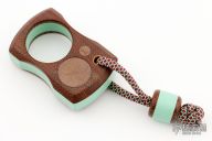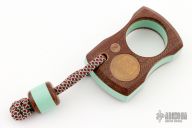 This knuckle by Hartland Knife & Tool is made from brown canvas micarta and tiffany blue G-10 with a matching bead. One side has a wheat penny back and the other side has a "hobo" penny with Lincoln's head as a skull. Excellent condition.