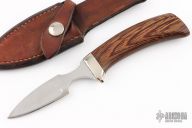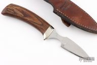 This Caper by Track Knives features a mirror polished blade with notched thumbrest, .155" blade stock and .855" blade depth, hidden tang construction. The handle has a nickel silver guard and wood grip. Comes with leather sheath. Has some scratches, has a small nick in the edge, otherwise good condition.