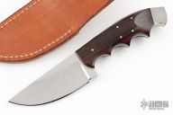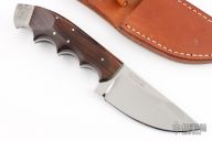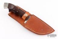 This fixed blade from Tom Barminski features a mirror polished blade with .173" blade stock and 1.543" blade depth, full tang construction. The handle has cocobolo scales and stainless steel rear bolsters with lanyard hole. Includes a brown leather sheath with belt loop. Excellent condition.
