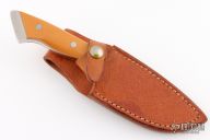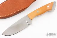 This fixed blade from Tom Barminski features a mirror polished blade with .248" blade stock and 1.464" blade depth, full tang construction. The handle has yellow paper micarta scales and stainless steel rear bolsters with lanyard hole. Includes a brown leather sheath with belt loop. Excellent condition.