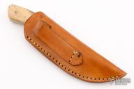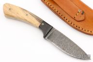 This Knife by Thomas Rucker features a Damascus blade with .146" blade stock and 1.102" blade depth, full tang construction. The handle has black wood bolsters and wood scales with mosaic pins, fileworked tang. Comes with a brown leather sheath. Excellent condition.