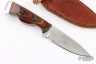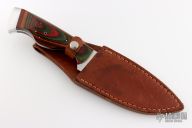 This fixed blade from Tom Barminski features a mirror polished blade with .164" blade stock and 1.467" blade depth, full tang construction. The handle has pakkawood scales and stainless steel rear bolsters with lanyard hole. Includes a brown leather sheath with belt loop. Has some light scratches and a couple small spots, otherwise good condition.