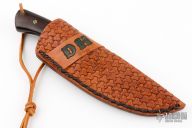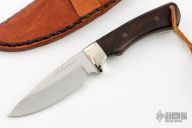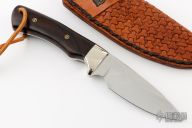 This Knife by Thomas Rucker features a mirror polished blade with .179" blade stock and 1.387" blade depth, full tang construction. The handle has nickel silver bolsters and desert ironwood scales with mosaic pins. Comes with a hand tooled brown leather sheath. Has a crack in one of the scales through one of the pins, and in both scales at the lanyard hole, otherwise good condition.