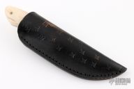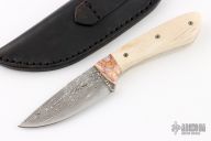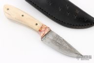 This Knife by Thomas Rucker features a San Mai Damascus blade with fileworked spine, .119" blade stock and 1.195" blade depth, full tang construction. The handle has mammoth tooth bolsters and camel bone scales with mosaic pins, fileworked tang. Comes with a hand tooled black leather sheath. Excellent condition.