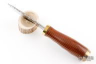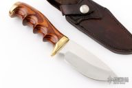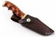 This knife by Perry Elder features a mirror polished blade with fileworked spine, .132" blade stock and 1.476" blade depth, hidden tang construction. The handle has a brass guard and butt with pakawood grip and black/white spacers. Coems with a brown leather sheath. Excellent condition.