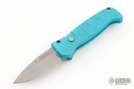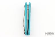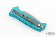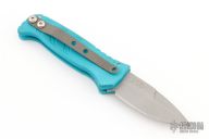 This CS (California Special) Militia side-opening automatic by Rob Dalton has a satin finished blade and milled teal anodized aluminum frame. Bead blast titanium clip. Strong and fast coil-spring opening. Has some scuffs, otherwise excellent condition.